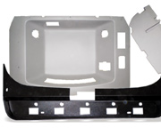 Изделия из полимерных листовых материалов (АБС-пластик, полистирол, полиэтилентерефталат, поликарбонат, композиций пластика: АБС/ПК, АБС/ТПУ, АБС/ПММА), по своим техническим характеристикам (прочность, коррозионная стойкость, легкость и др.), успешно конкурируют в первую очередь с металлом и стеклом в производстве автомобилей, предметов бытового потребления, электронной/электротехнической промышленности. Использование пластиков позволяет создавать уникальные по форме объемные элементы деталей. Готовые изделия могут иметь матовую или глянцевую поверхность, различные виды тиснения (глянец, «кожа», «песок»), цвет в массе — по желанию заказчика, согласно каталога RALL.